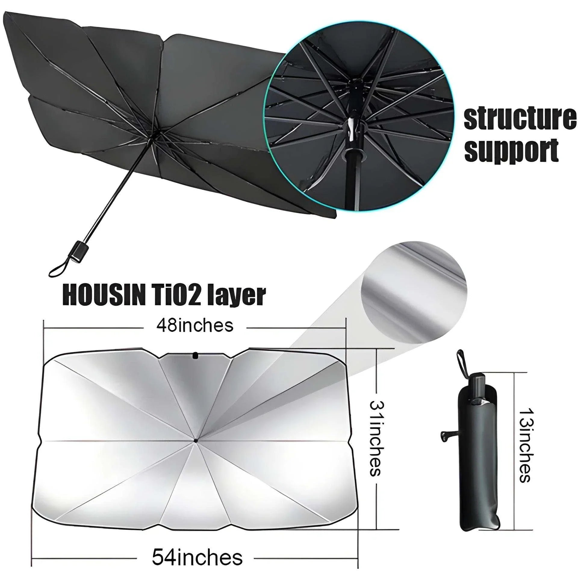 Made of high-hardness steel, JASVIC car sunshade umbrella is heat insulation, UV block and reliable to use for long service.